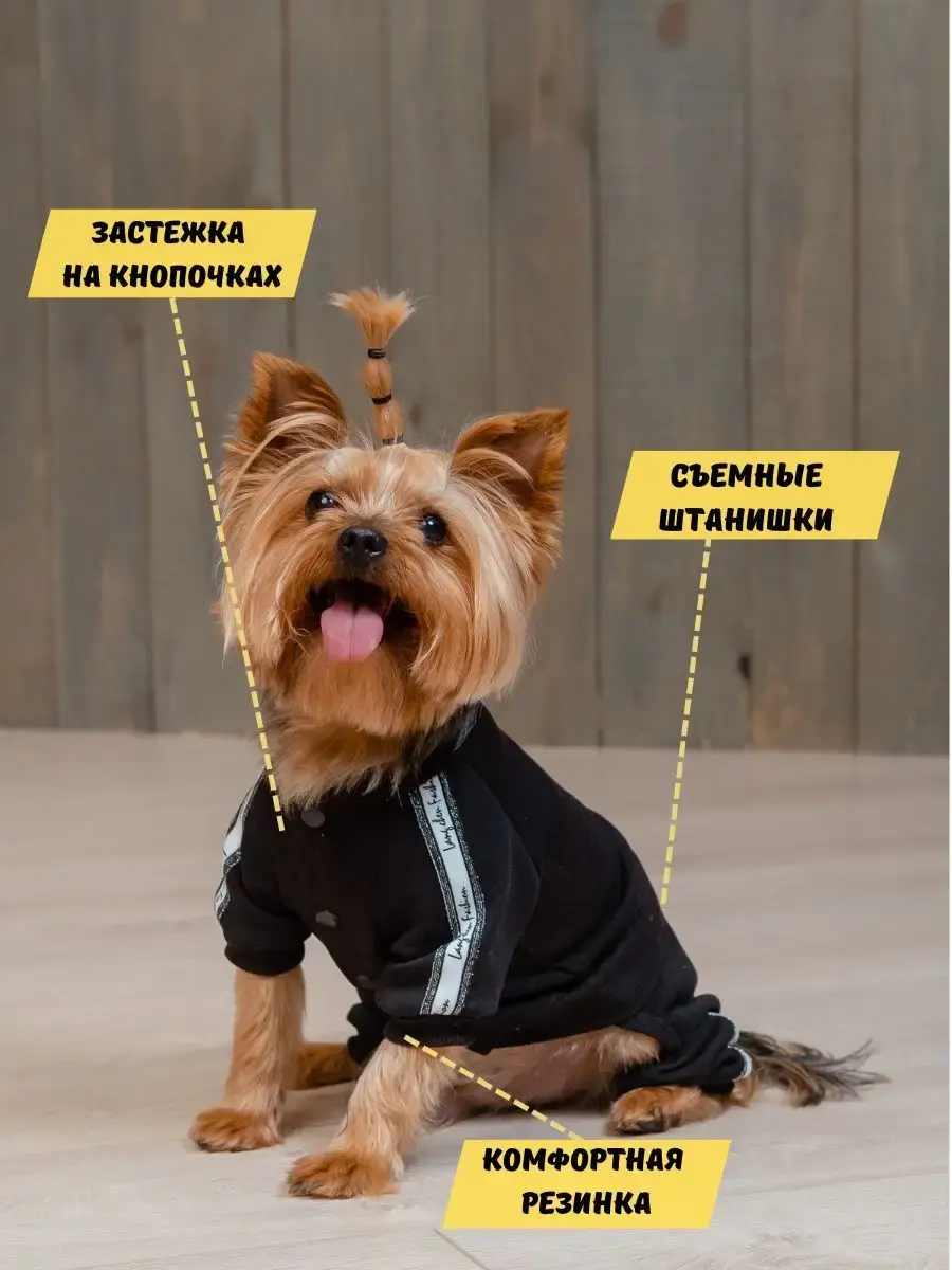 Спортивный комбинезон для ваших стильных питомцев, который состоит из кофточки и штанишек на клепках. Комбинезон - костюм отлично подойдет для мелких и средних пород. В этом костюме будет удобно играть и бегать. Кофточка легко надевается и застегивается кнопками, по желанию ее можно носить отдельно,отстегнув штанишки.