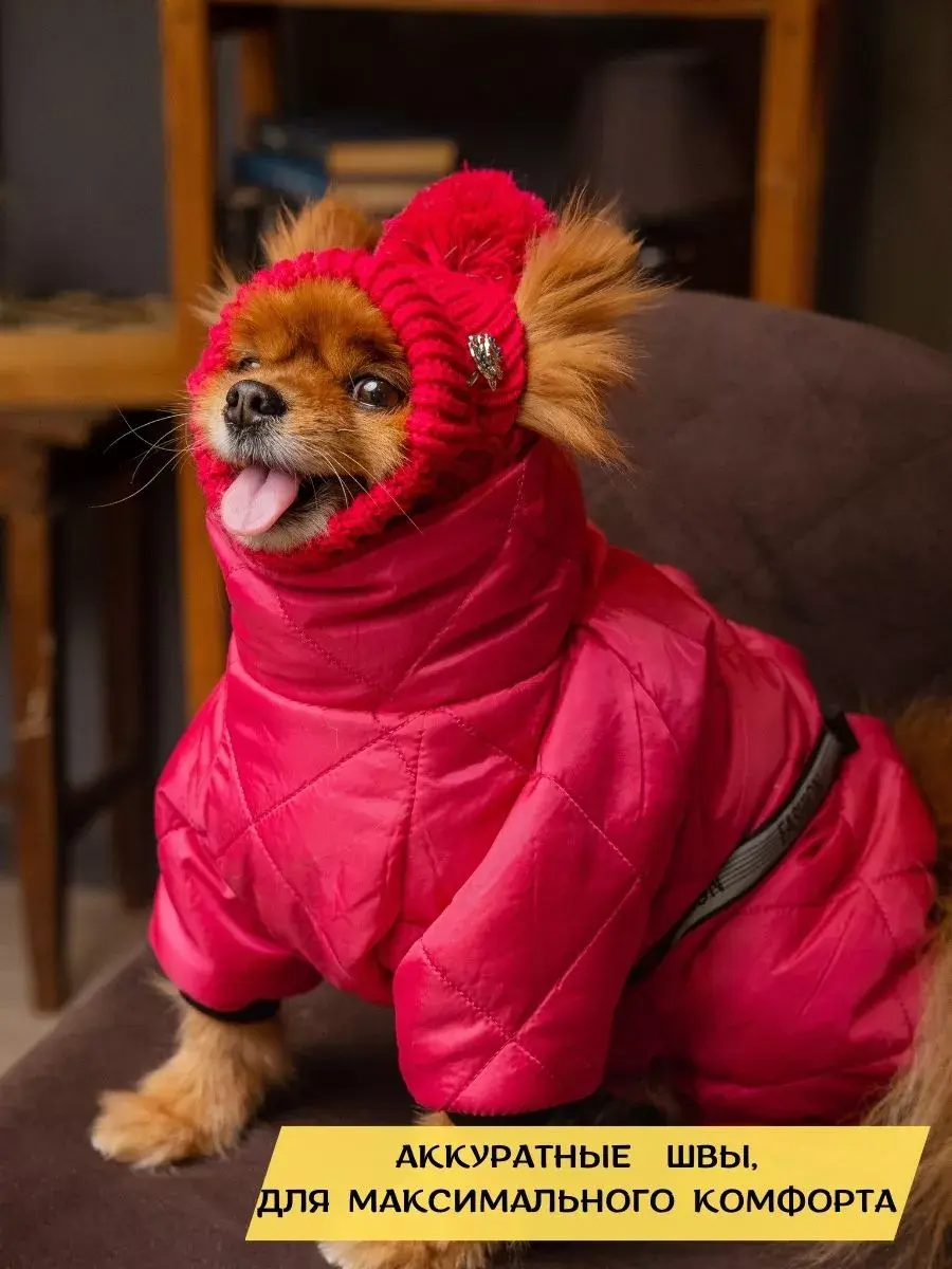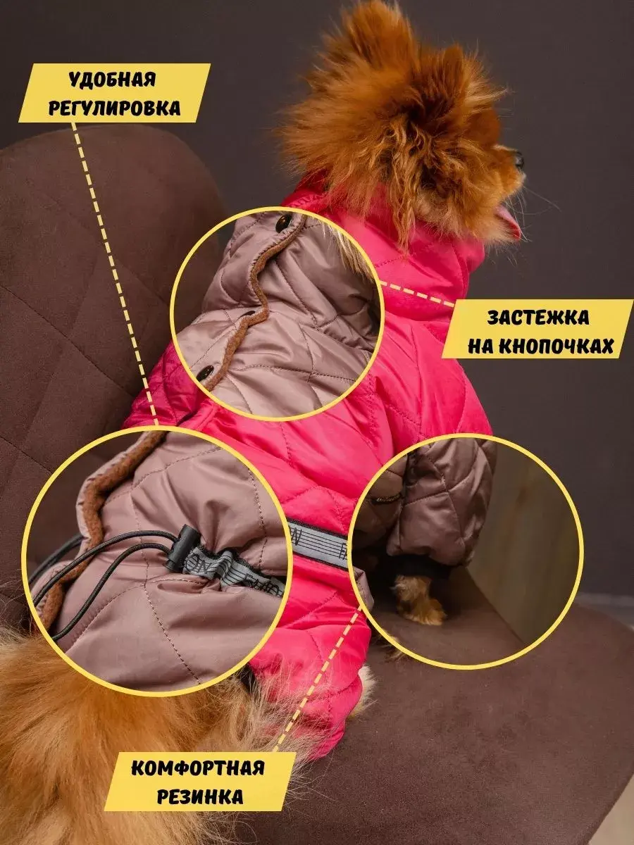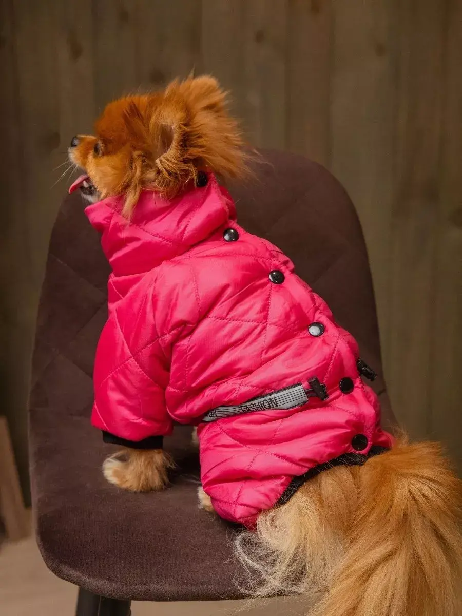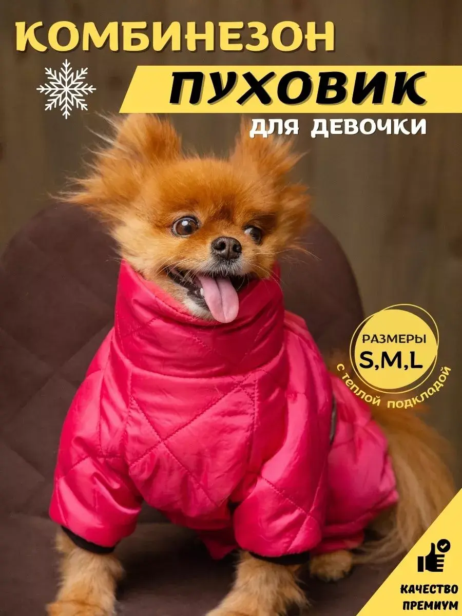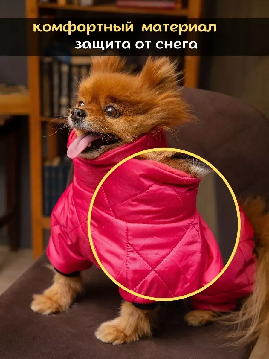 Зимний комбинезон защитит вашего питомца от снега. Подходит этот пуховик для собак мелких и средних пород, а чтобы одежда для собаки сидела по фигуре, есть резинки-затяжки на поясе. Это уникальная одежда, при морозной и ветреной погоде. Верхняя одежда для собак имеет застёжки на кнопках на спине, что позволяет легко и удобно одевать и снимать его. Высокий воротник защитит шею от ветра и снега, минимизирует риск заболевания собаки. Комбинезон прикрывает все части тела вашего питомца. Данная модель подходит для девочек. Это отличный подарок на новый год хозяевам питомцев, мелких и средних пород.